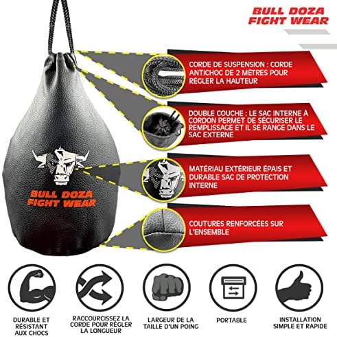 🤼 REMPLISSEZ-LE, SUSPENDEZ-LE, ESQUIVEZ-LE 🤼♀️🤾♂️ Ajoutez jusqu’à 1 kg de riz non cuit dans le sac à cordon intérieur. Fermez-le. Suspendez-le et réglez la hauteur à l’aide des 2 mètres de corde antichoc fournie. Il suffit de nouer la corde lorsque le sac est à la hauteur du menton, et c’est parti 🥊💣😄